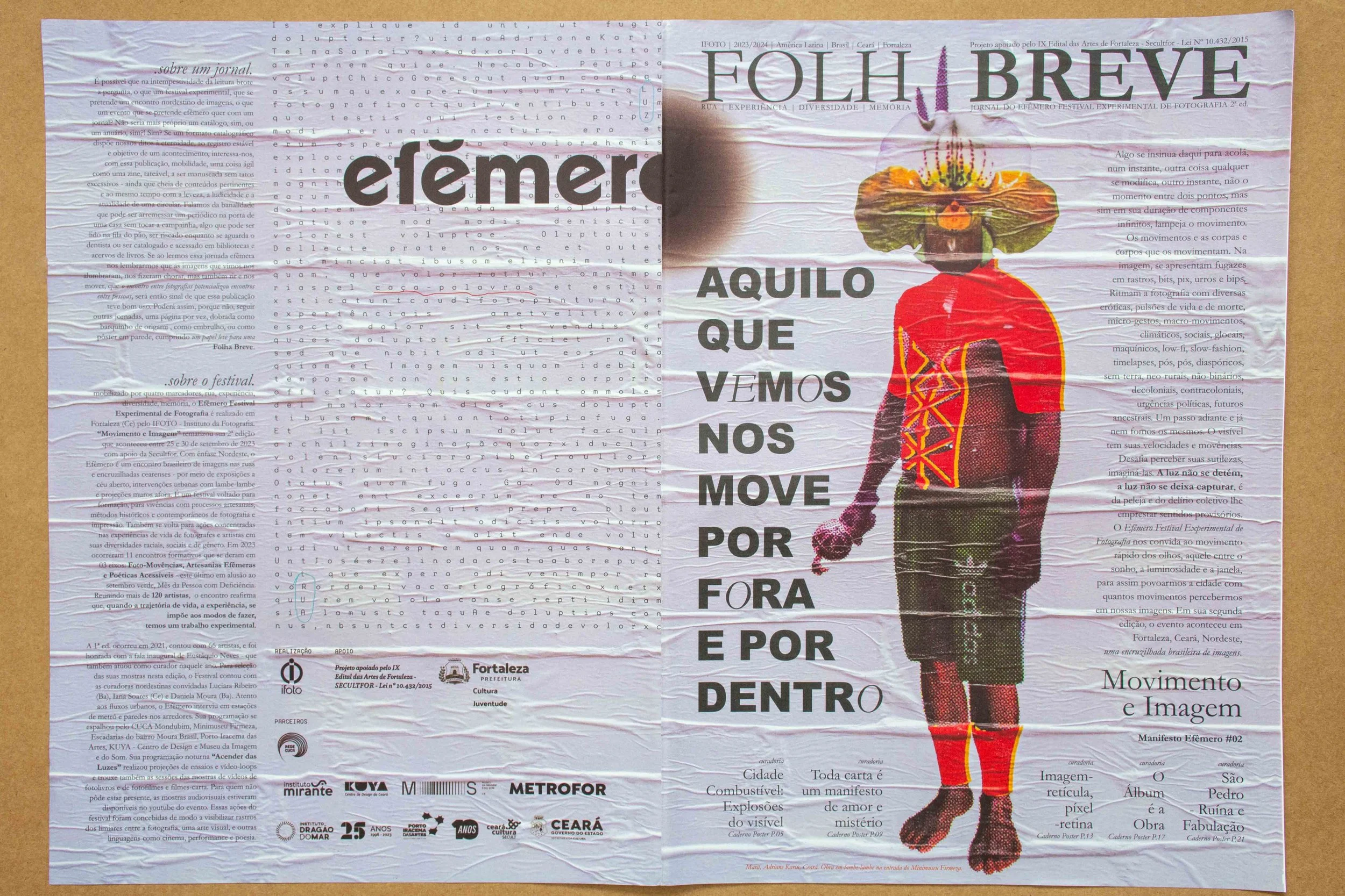 Movimento e Imagem tematiza a 2ª edição do Efêmero Festival Experimental de Fotografia que acontece de 26 de setembro a 1º de outubro de 2023 com apoio da Secultfor e realização do Ifoto – Instituto da Fotografia. Mobilizado por quatro marcadores “rua, experiência, memória e diversidade”, o evento promove intervenções urbanas, projeções, oficinas e encontros nos muros e metrôs de Fortaleza/Ceará. Com ênfase na região Nordeste, o Efêmero traz fotografias de todo o Brasil para as ruas cearenses por meio de exposições a céu aberto, lambe-lambe, conversas experimentais e mostras que friccionam o limiar da fotografia com outras linguagens artísticas como pintura, cinema e a literatura.
